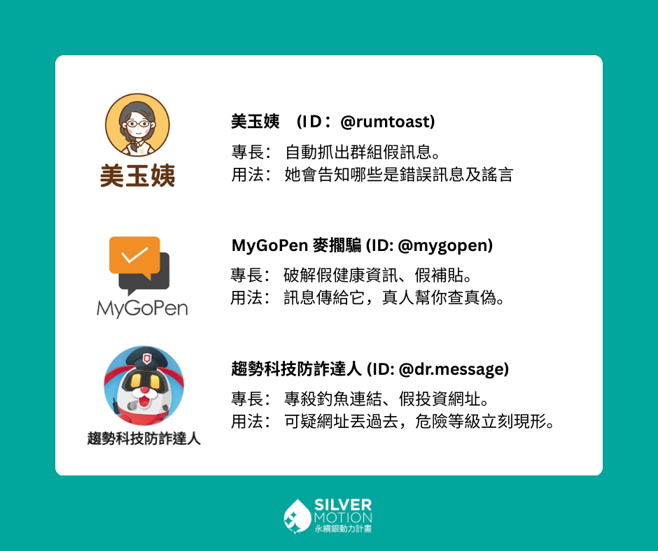 為了保護長輩的錢包與健康,我們建議在 LINE 裡面加入這三位「數位糾察隊」,只要把可疑訊息傳給他們,他們就會立刻告訴你答案!