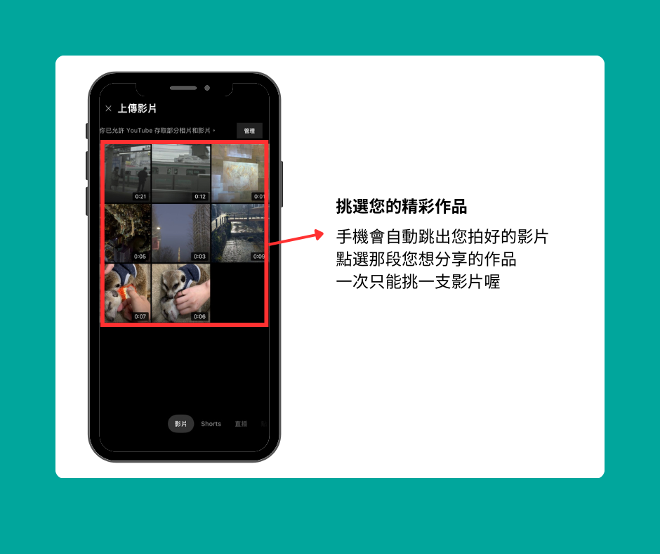 選影片: 手機會自動跳出您拍好的影片,點選那段您想分享的作品。