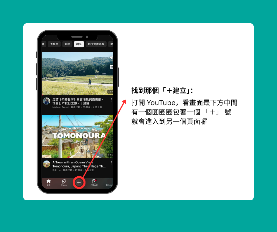 找到那個「+建立」: 打開 YouTube,看畫面最下方中間,有一個圓圈圈包著一個 「+」 號。